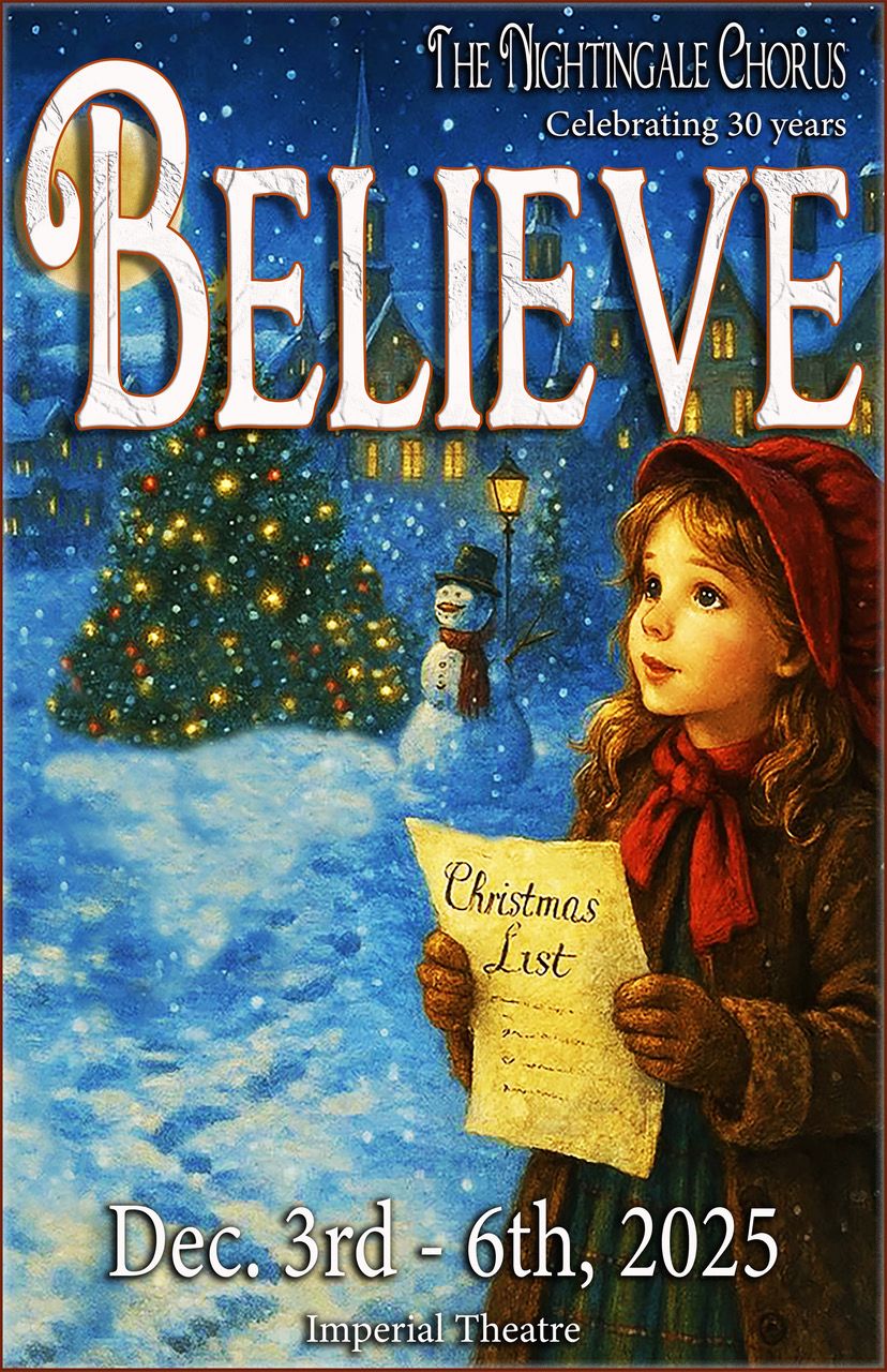 The Nightingale Chorus is proud to present “Believe” a journeyback to a simpler time. Join us as we follow Suzie as she learns to believe inthe magic of Christmas and discovers that she, herself, possesses the power tomake it happen. Suzie ultimately seeks that “something special” that brings usall together and makes anything possible.